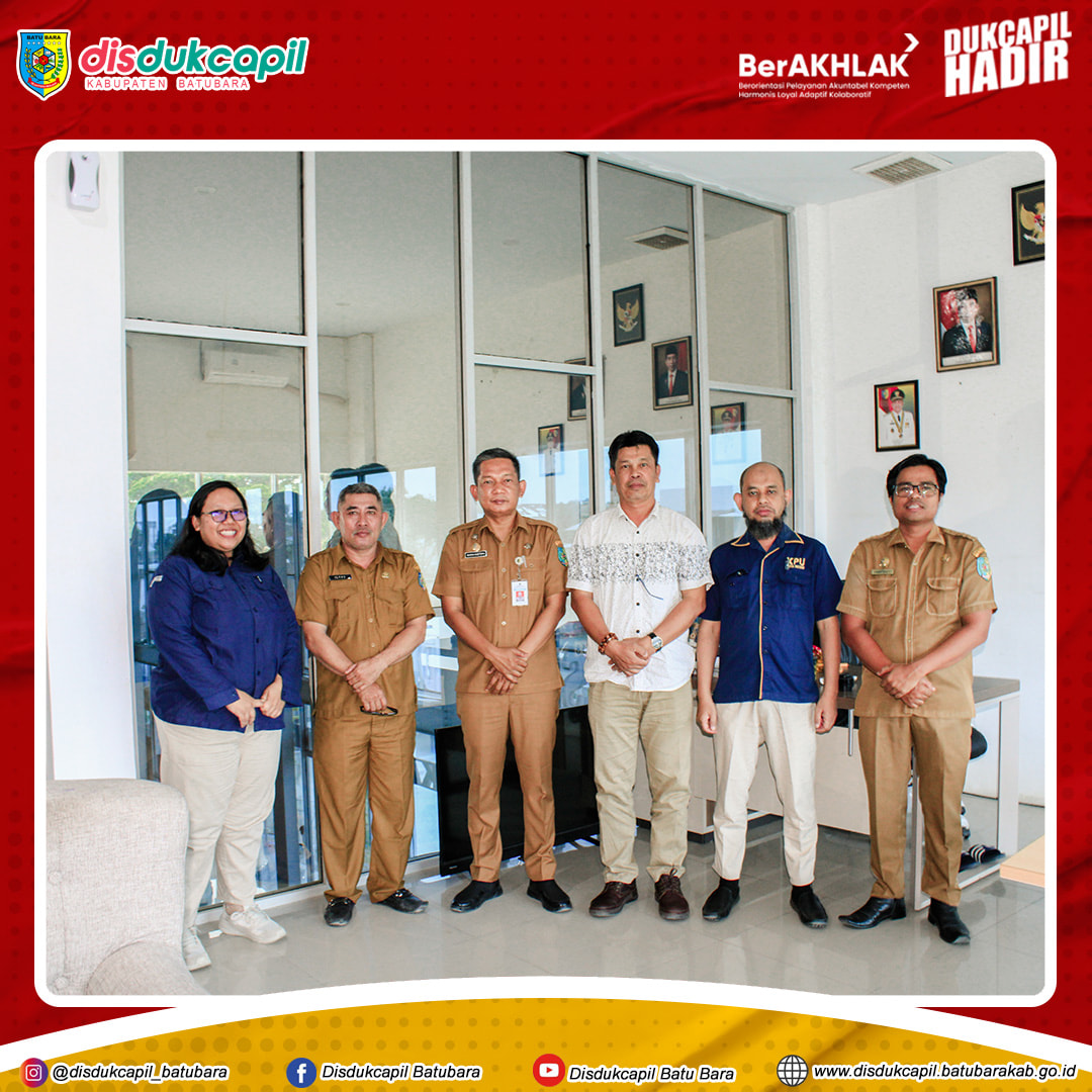 Komisi Pemilihan Umum Kabupaten Batu Bara Kpu Batubara berkunjung ke Kantor Disdukcapil Kabupaten Batu Bara, dalam rangka silaturahmi dan koordinasi terkait persiapan pemilihan umum serentak tahun 2024.